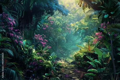 Fototapeta premium Lush greenery and vibrant flowers illuminated in a mystical twilight rainforest scene