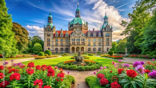 Obraz premium Lush greenery and vibrant flowers surround a majestic palace with intricate stone carvings and ornate details in Hannover Germany , Germany, Nature