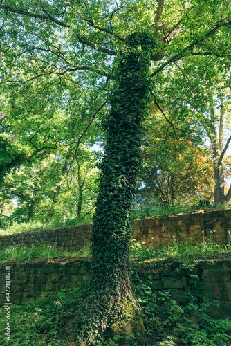 Obraz premium Lush greenery entwines a majestic tree in a tranquil forest oasis during a sunlit afternoon