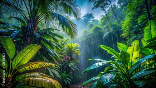 Fototapeta premium Lush greenery envelops the tranquil rainforest, with gentle rain softly falling, crafting a serene atmosphere amidst the rich foliage and vibrant sounds of nature.