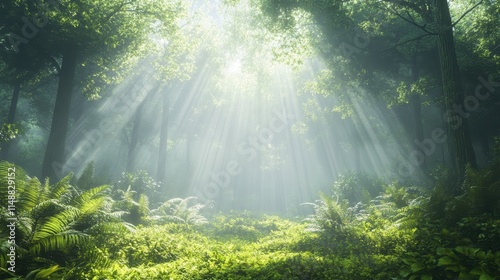 Fototapeta premium Lush greenery filled with vibrant foliage, dappled sunlight filtering through dense tree canopies.