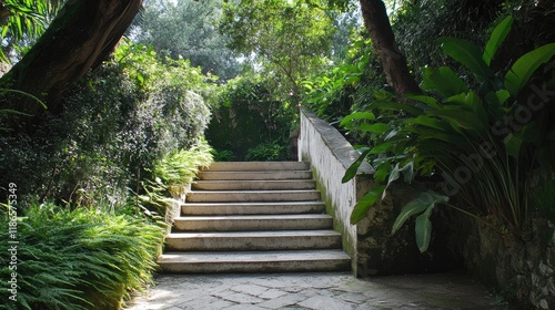 Obraz premium Lush Greenery Framed Staircase Leading to a Serene Garden Pathway in Natural...