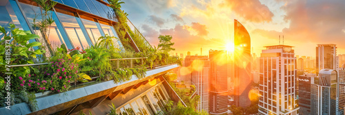 Fototapeta premium Lush greenery on buildings with a vivid sunset over city skyscrapers reflecting eco-progress