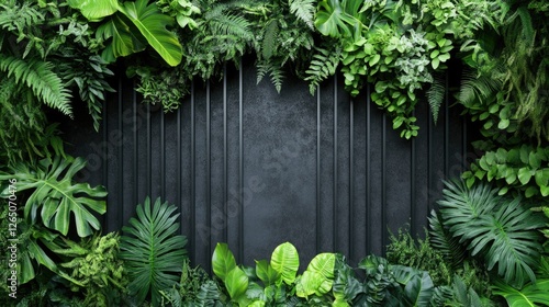 Fototapeta premium Lush Greenery on Dark Wall: A Tropical Paradise
