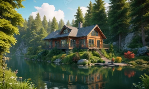 © JKLoma, Obraz premium Lush greenery surrounds the charming lake house, shrubs, nature