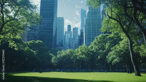 © Aris Suwanmalee, Fototapeta premium Lush greenery with urban skyline backdrop.