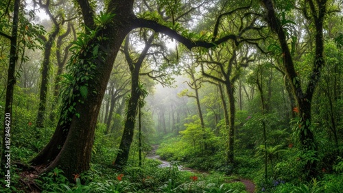 © Lemdah, Obraz premium Lush, humid rainforest scene with winding path and dense foliage