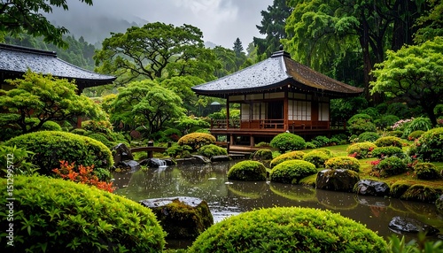 Obraz premium Lush Japanese garden, rain