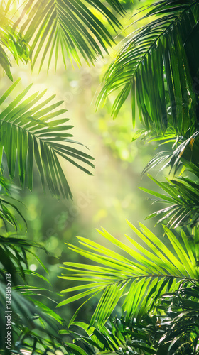 Naklejka premium Lush Jungle Foliage: Capturing the heart of a vibrant jungle, sunlight streams through verdant palm leaves and dense foliage, creating a scene of natural serenity and tropical allure.