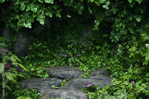 © Art Jabz, Obraz premium Lush jungle scene, rocks, flowers, vines, background, product display