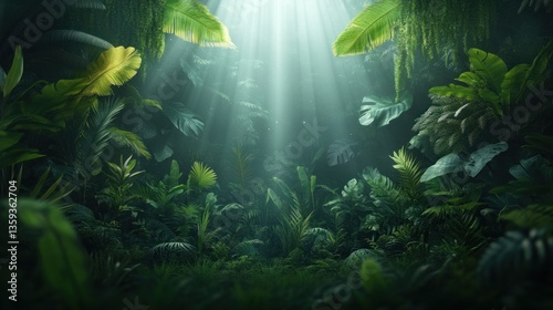 Fototapeta premium Lush jungle scene, sunlight filtering through canopy