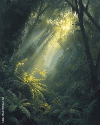 Fototapeta premium Lush jungle scene with sunlight filtering through dense foliage.