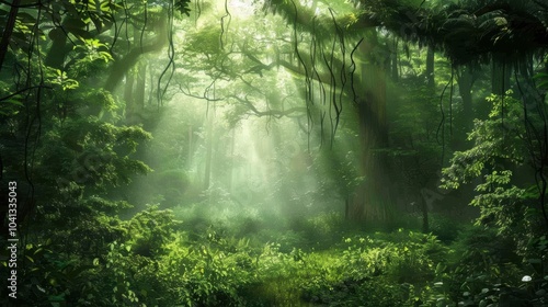 Fototapeta premium Lush Jungle Scene with Vines and Light Rays
