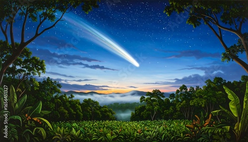 Obraz premium Lush jungle vista at dawn with comet