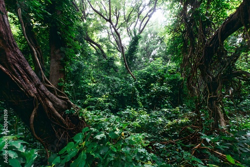 Fototapeta premium Lush jungle with dense plants, towering trees, and intertwining vines.