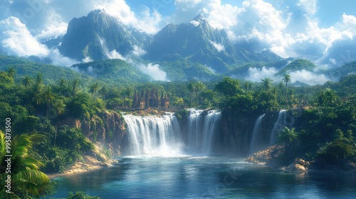 Obraz premium Lush landscape featuring waterfalls and mountains under a bright sky.
