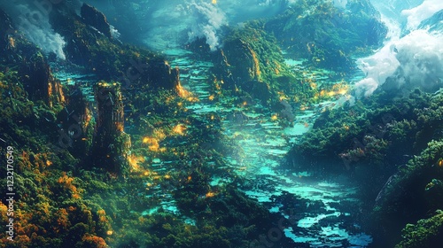 © dongwei, Obraz premium Lush Landscape of Flowing Water and Vibrant Connectivity in Nature
