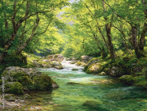 © Hengki, Obraz premium Lush landscape painting of a stream flowing through a sun-dappled forest