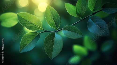 Fototapeta premium Lush leaves branch, dappled sunlight, forest background, nature detail