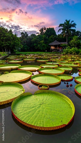 © Fajar, Fototapeta premium Lush lotus pond at sunset