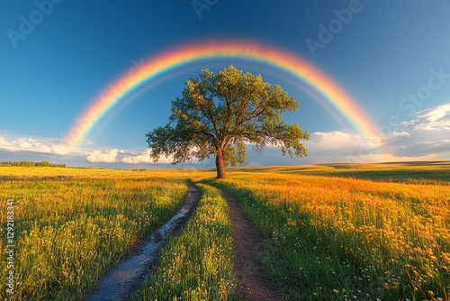 © nurdesign99, Naklejka premium Lush Meadow Landscape with a Majestic Tree Framed by a Vibrant Rainbow