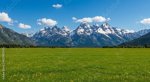 © time, Fototapeta premium Lush Meadow Meets Majestic Mountains in a Sunny Summer Day