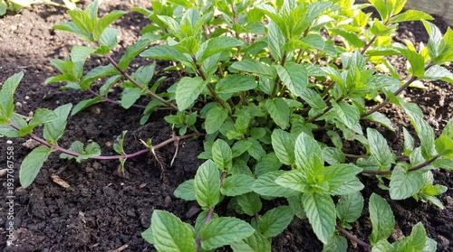 Obraz premium Lush mint plants growing in a garden bed with rich soil