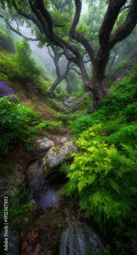 Obraz premium Lush, misty forest path