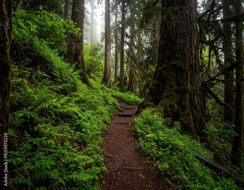 © salvia, Fototapeta premium Lush, misty forest path. A well-worn trail winds through a verdant, damp forest. Tall, mossy trees line the path