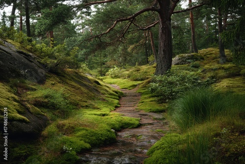 Fototapeta premium Lush Moss Pathway Through a Serene Green Forest Creating a Tranquil Nature...