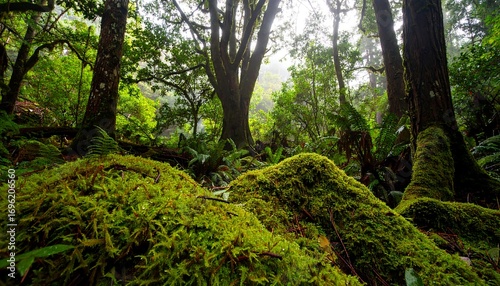 © Pisang, Obraz premium Lush mossy forest floor, sunlight filtering through trees