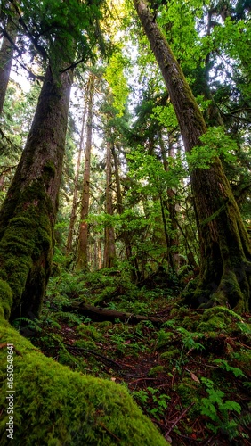 © Nuri, Naklejka premium Lush, mossy forest floor viewed from low angle, sunlight dappling through tall trees