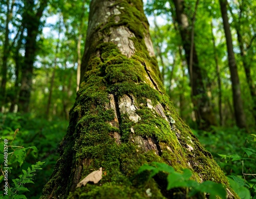 © Romlan, Obraz premium Lush mossy tree trunk in a forest