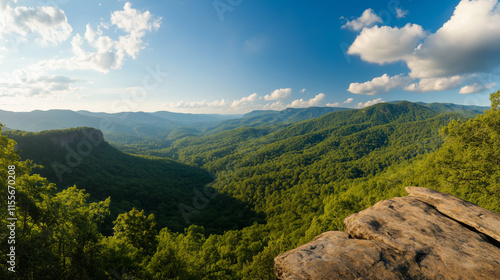 © fotofabrika, Obraz premium Lush mountain landscape under a bright blue sky in summer with fluffy clouds and distant hills