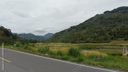 © Syawal art, Naklejka premium Lush Mountain Landscape with Rice Fields and Cloudy Sky, Roadside View.