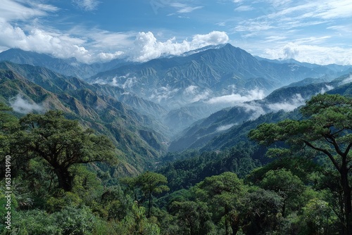 © pedro, Fototapeta premium Lush mountain valley vista under a partly cloudy sky