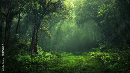 © AImmersive Imagery, Obraz premium Lush natural rubber tree plantation forest with dense greenery and sunlight filtering through the canopy creating a serene atmosphere.