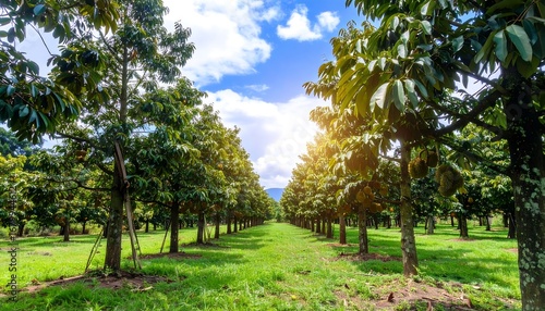 © Okta, Fototapeta premium Lush orchard pathway under a bright sky