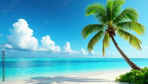Fototapeta premium Lush palm tree on idyllic tropical island, vibrant colors, scene, leaves, background