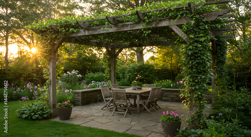 © Tia, Obraz premium Lush Pergola in a Serene Garden Setting at Sunset Glow Landscape