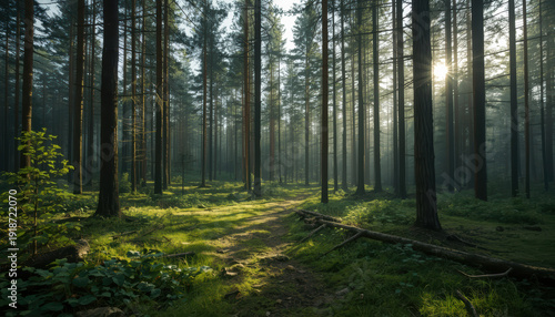 Fototapeta premium Lush pine forest path with morning light and misty atmosphere