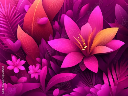 © Supardi, Fototapeta premium Lush pink floral arrangement with vibrant hues and stylized leaf designs