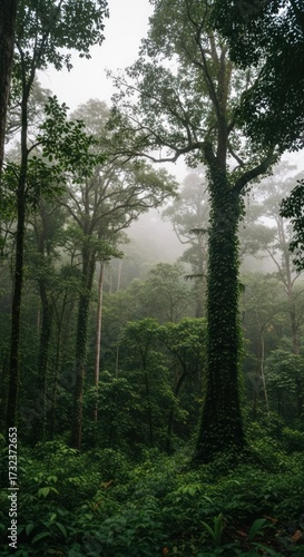 © Ahmad, Obraz premium Lush Rainforest Canopy - A Misty Morning in the Jungle.