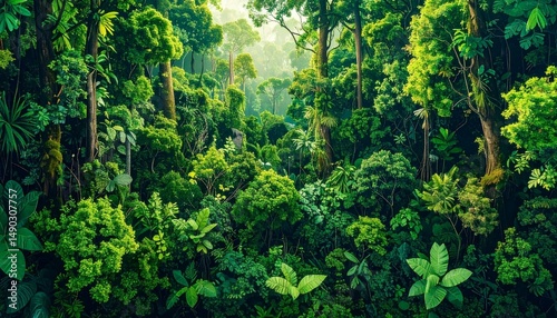 © esta, Fototapeta premium Lush Rainforest Canopy, Sunlight Dappled