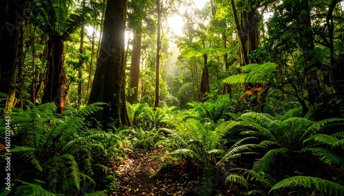 Fototapeta premium Lush rainforest path bathed in sunlight