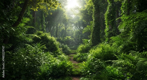 Obraz premium Lush Rainforest Path - Serene path through a vibrant, sun-dappled rainforest....
