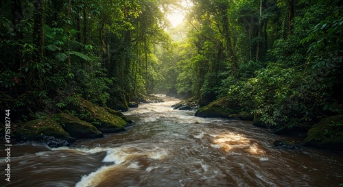 Obraz premium Lush Rainforest River: Sunlight Streaming Through Emerald Canopy, Mossy...