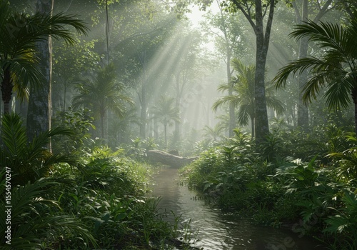 © bayunurfandhi, Fototapeta premium Lush rainforest scene sunbeams through tropical vegetation
