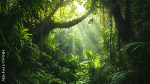 Naklejka premium Lush Rainforest Sunlight Beams Through Canopy