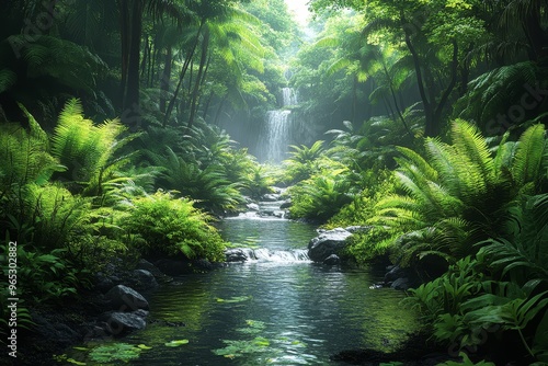 Obraz premium Lush Rainforest Waterfall and Stream